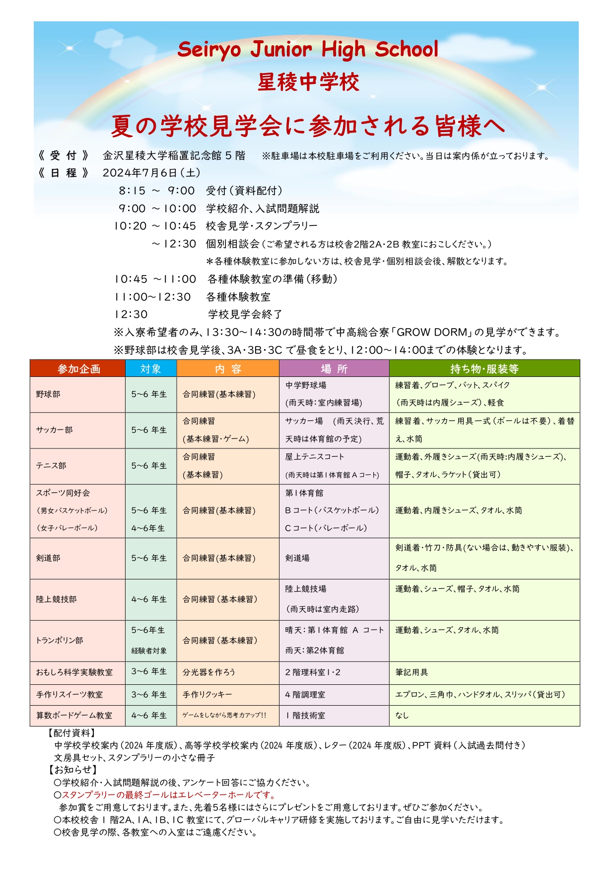 内 容:入試問題解説、学校紹介、校舎見学(ESS部スタンプラリー)、各体験教室、部活動体験、個別相談会(希望者)
