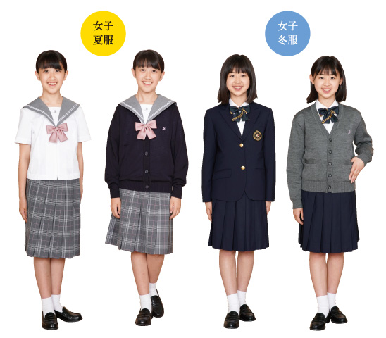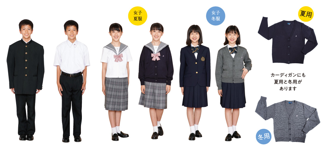 男女の制服を冬服と夏服に分けてご紹介します。それぞれに正装とバリエーションパターンがあるため、組合せが多彩でお洒落が楽しめます。