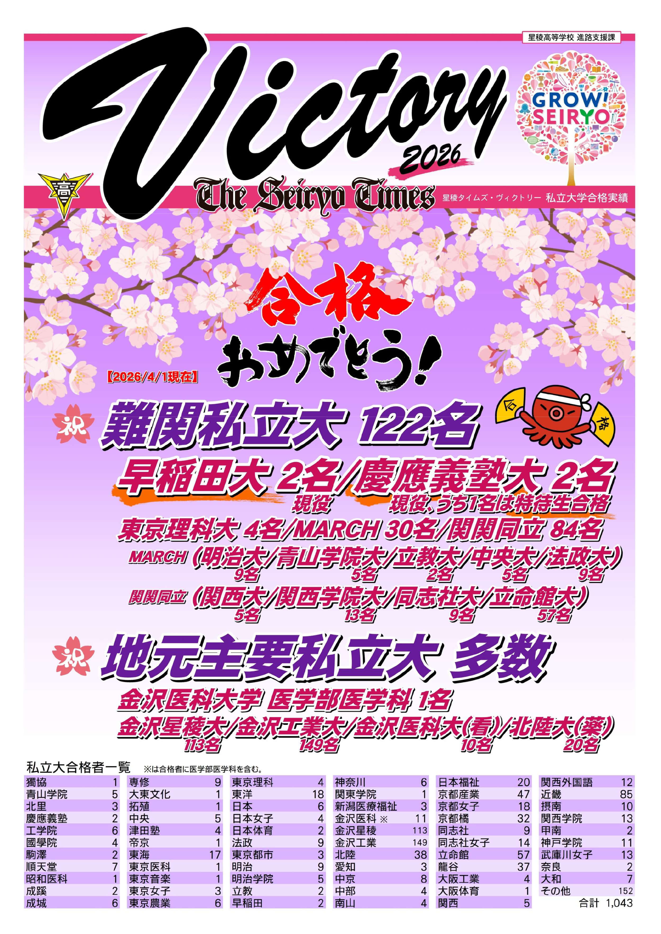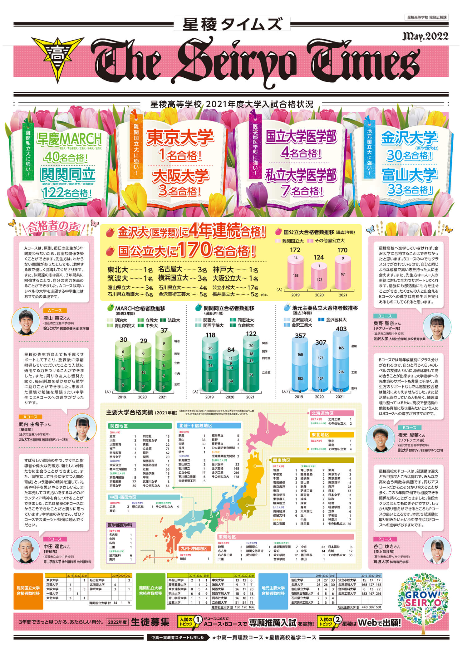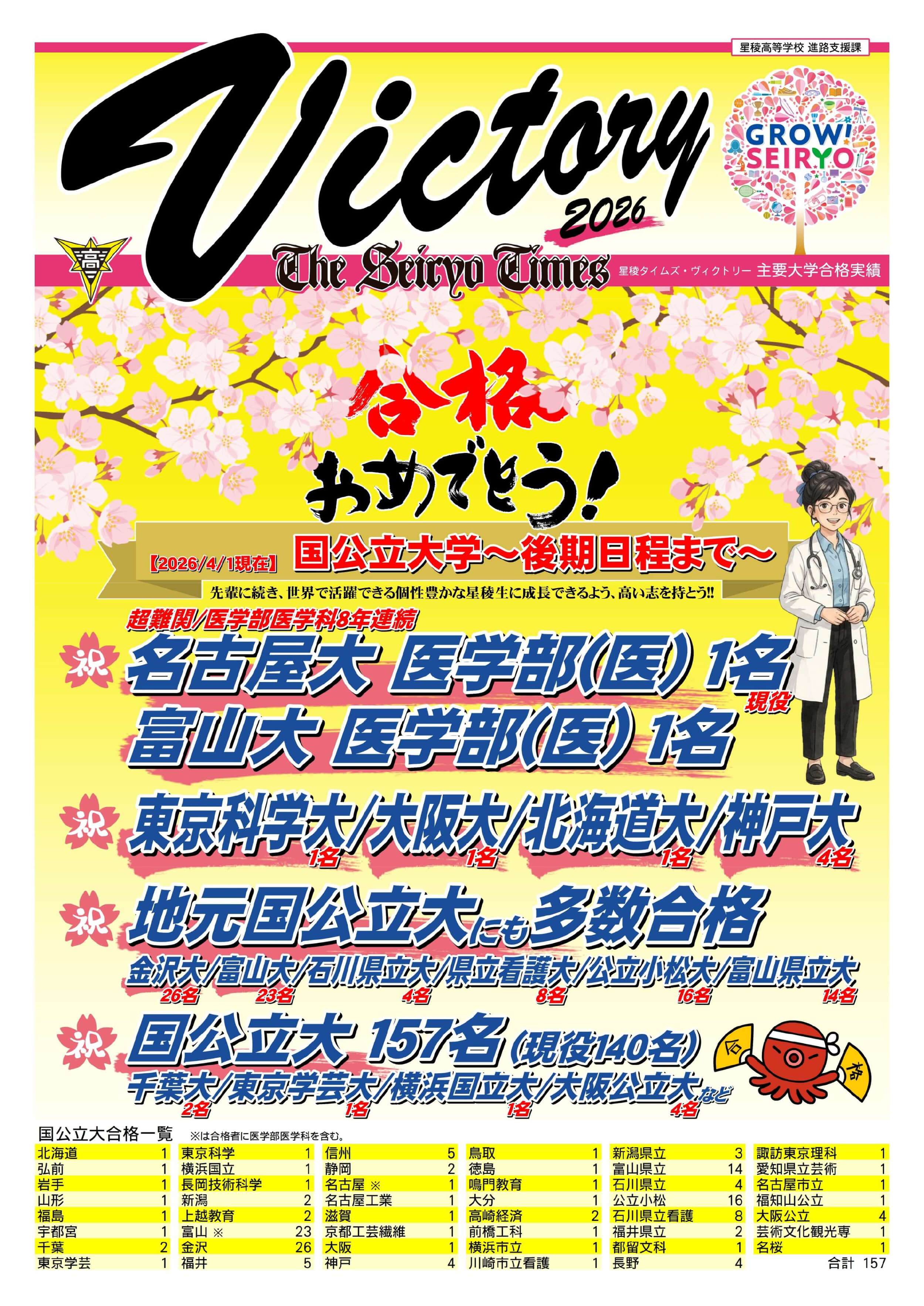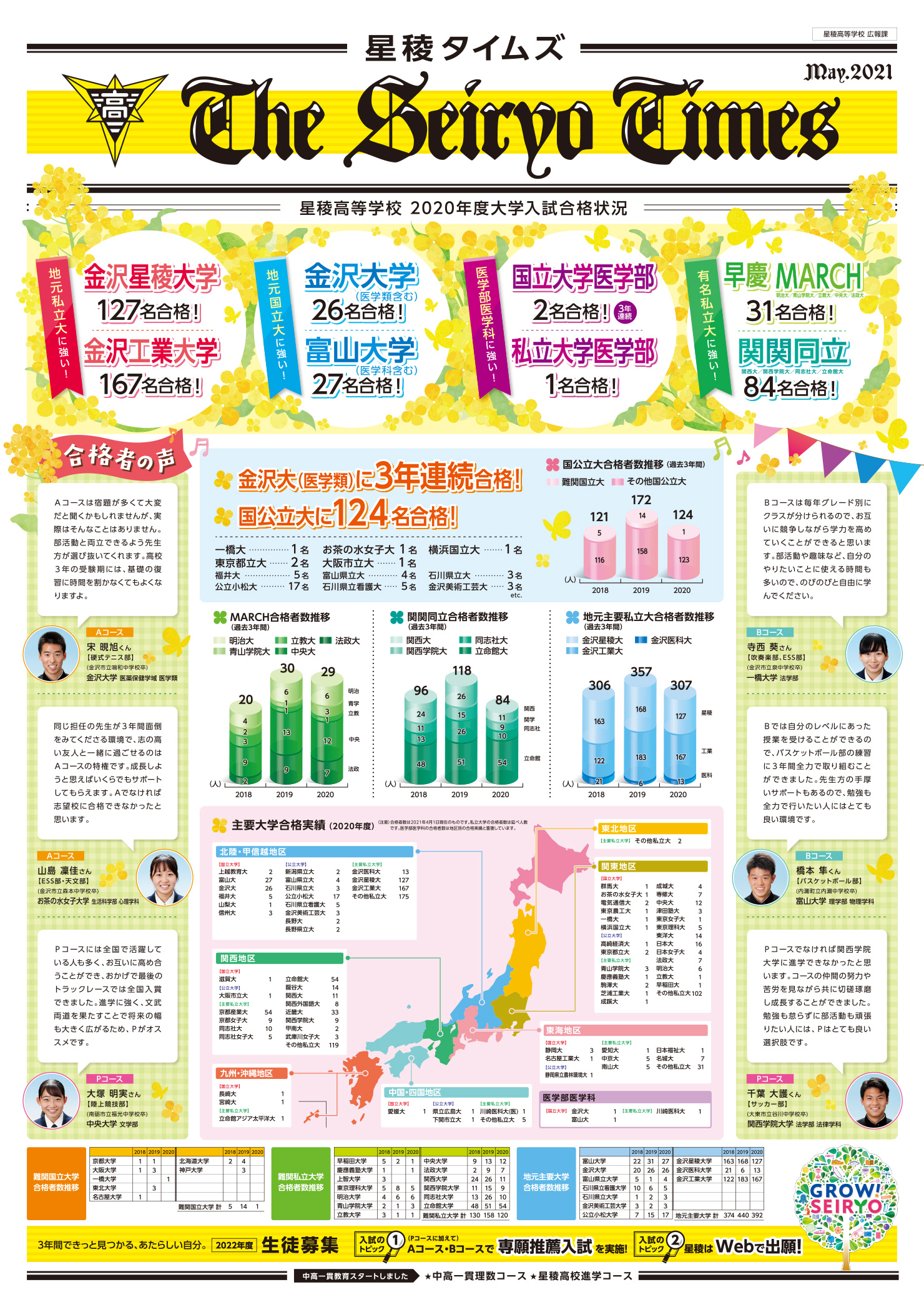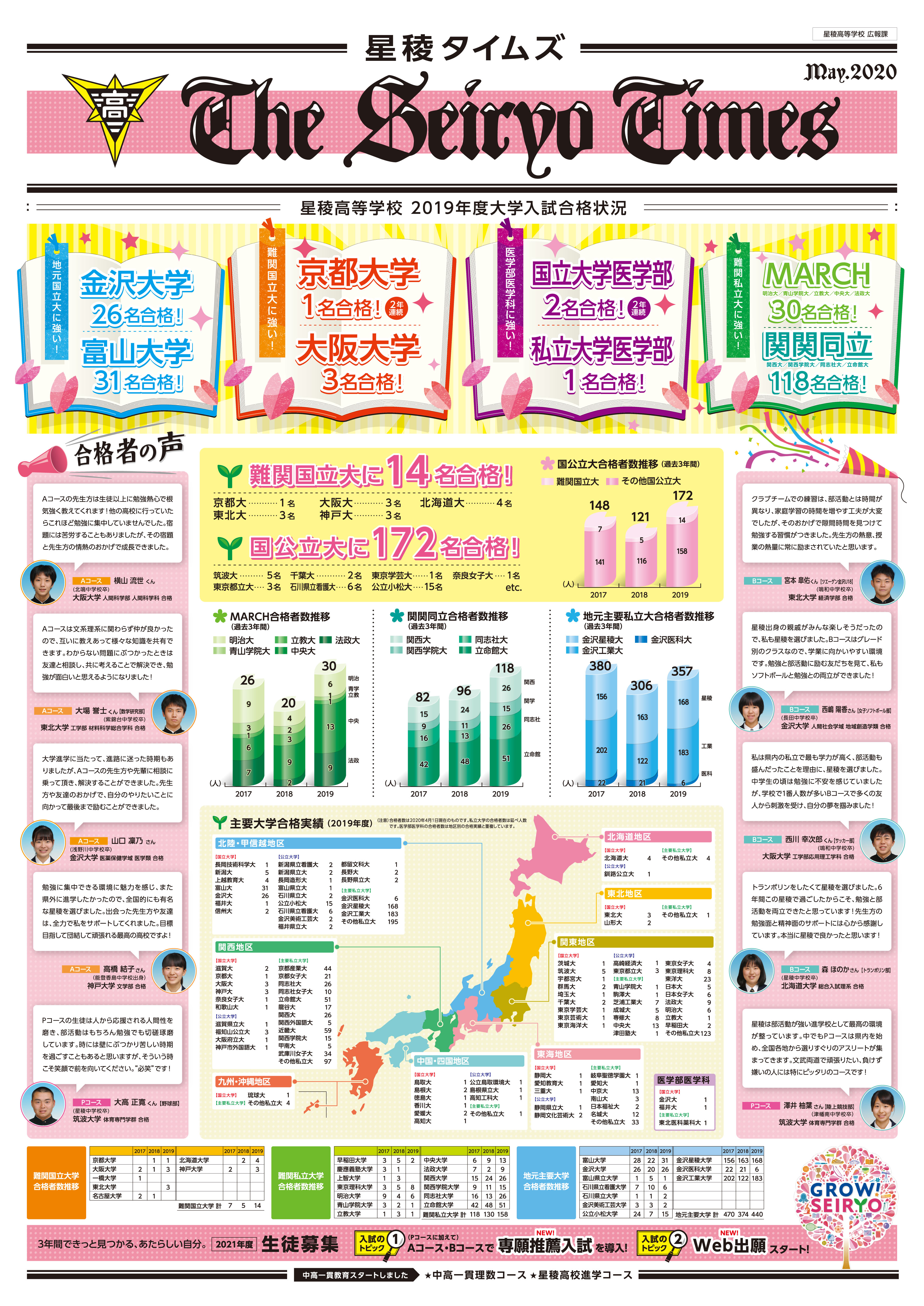 国公立・私立大学、短期大学、専門学校、大学校への最新合格実績をはじめ、過去の進学状況についてもグラフ等を使い、わかりやすくご紹介します。