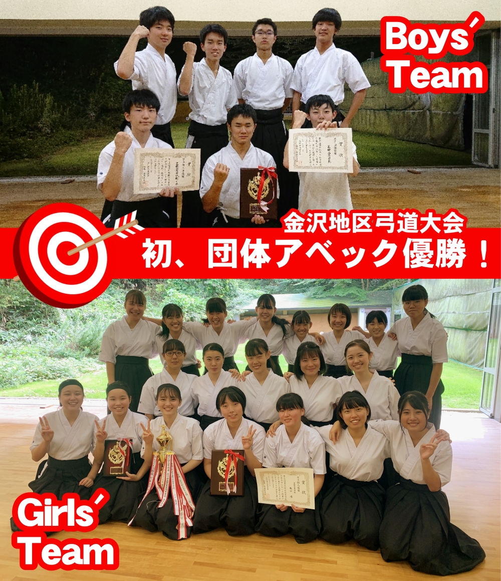 9月13日(日)、石川県立武道館にて金沢地区弓道大会が開催されました。出場できるチーム数を減らし、各チーム1時間以内に競技を終えるといった万全な感染予防対策のもと、たくさんの方々のご協力のお陰で、約半年ぶりに開催できた大会となりました。いつもとは異なる独特な雰囲気の中での大会ではありましたが、選手全員が「大会に出場できる」という感謝の気持ちを持って臨み、見事男女ともに団体優勝を果たすことができました!!また、男子個人の部では開 千珠が第2位、女子個人の部では牧口 遥が優勝し、男女ともに新体制としての良いスタートがきれたと思います。次は、11月の新人大会に向けて、さらに力をつけて躍進していきます!応援よろしくお願いします!
