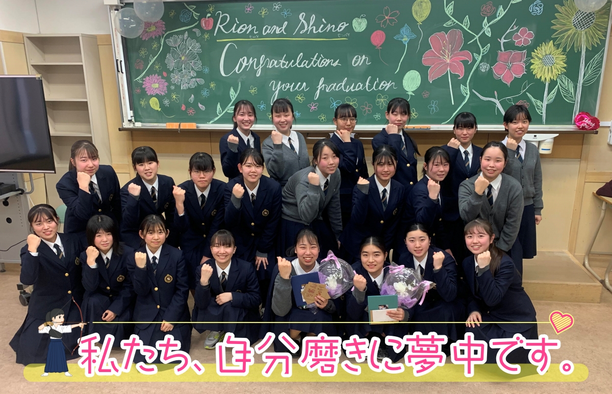 心身ともに成長発達段階である高校生にとって、部活動は学校の教育課程内では補えない大切な体験・学びができる場です。同じ目的をもつ仲間とのかかわりの中に、困難に立ち向かう力、協調性や体力の向上等、机上だけでは学ぶことのできないたくさんの学びが期待できます。弓を通じて人間のあるべき姿に近づこうという道、これが「弓道」であるということを、部活動を通して伝えたいと思っています。女子弓道部で「弓道」を学び、立派に卒業していく部員たちの声を抜粋してご紹介させてください。
