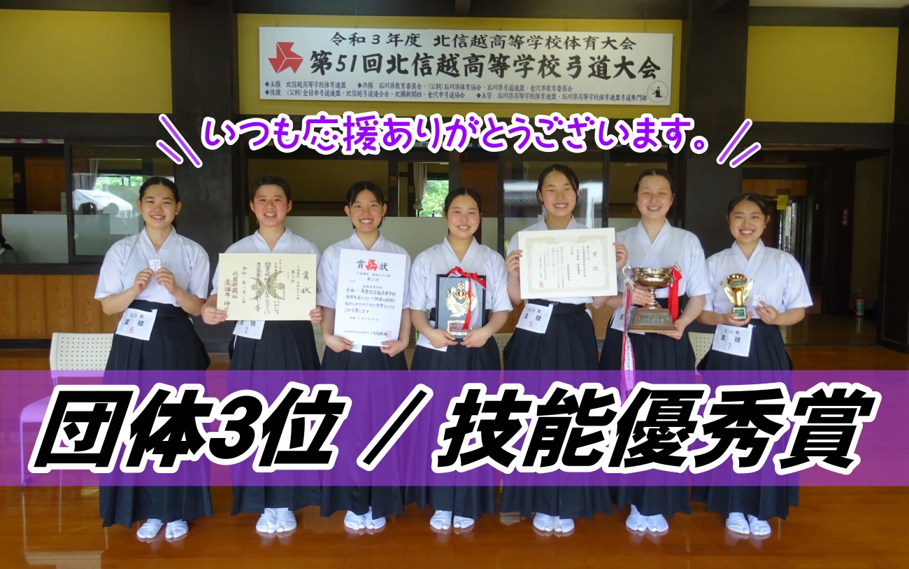 6月19日(土)・20日(日)に石川県の県立武道館にて第51回北信越高等学校弓道大会が開催されました。私たちは北信越大会に深い思い入れがあります。昨年出場した北信越新人大会では予選敗退となり、自分たちの未熟さを実感させられる悔しい大会となってしまいました。だからこそ、今回の北信越大会では前回のようなことを繰り返す訳にはいかないと、県総体の団体優勝に満足することなく、臥薪嘗胆の精神で、北信越大会優勝!技能優秀賞!!を目標に大会に挑みました。結果は惜しくも団体3位でしたが、技能優秀賞を頂くことができました!1年生の頃から正射必中、修技錬心を心に刻み、稽古に励んできた日々の努力がようやく報われた気がします。そして、何よりこのような素晴らしい賞を頂けたのは、熱心に指導してくださる先生方、一緒に練習してきた仲間、どんな時でも応援してくれる家族、たくさんの方々の応援、支えがあったからです。応援してくださった全ての方々に感謝しています。7月に行われるインターハイは私たちにとって最後の試合となります。昨年、新型コロナウイルスの影響で一緒にインターハイの舞台に立てなかった先輩方、部員全員の思いを背負い、日本一という最高の景色がみられるように全力で戦ってきます。応援よろしくお願いいたします。