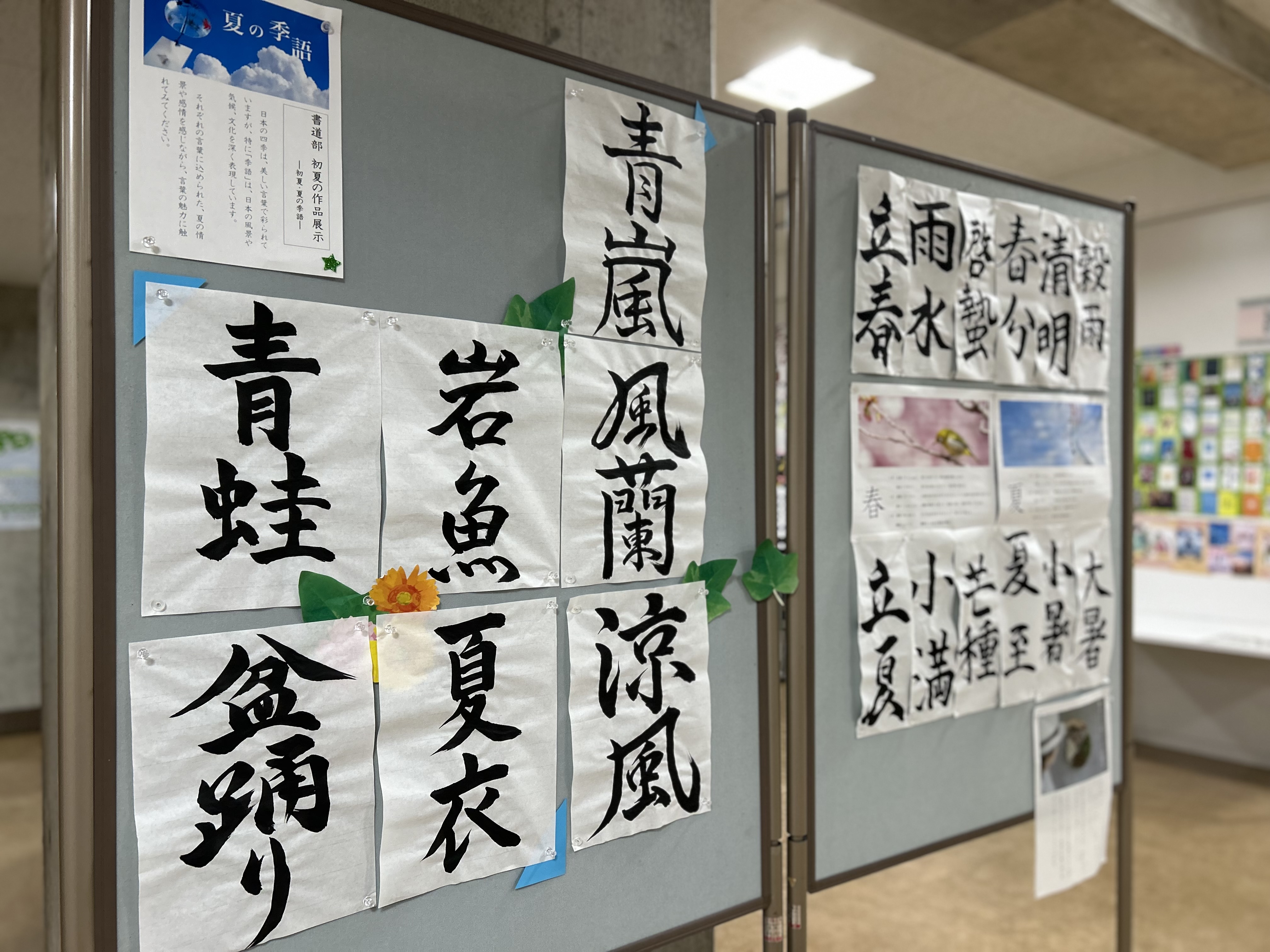 「初夏・夏の季語」と題し、作品を展示しました。美しい言葉で彩られる日本の四季ですが、特に「季語」は、日本の風景や気候、文化を深く表現しています。たくさんある季語の中から、それぞれの部員がこれぞと思う季語を選びました。夏の情景を思い描きながら一筆一筆丁寧に書き、言葉の魅力を感じる時間となりました。二十四節気とともに季節感あふれる展示となっています。