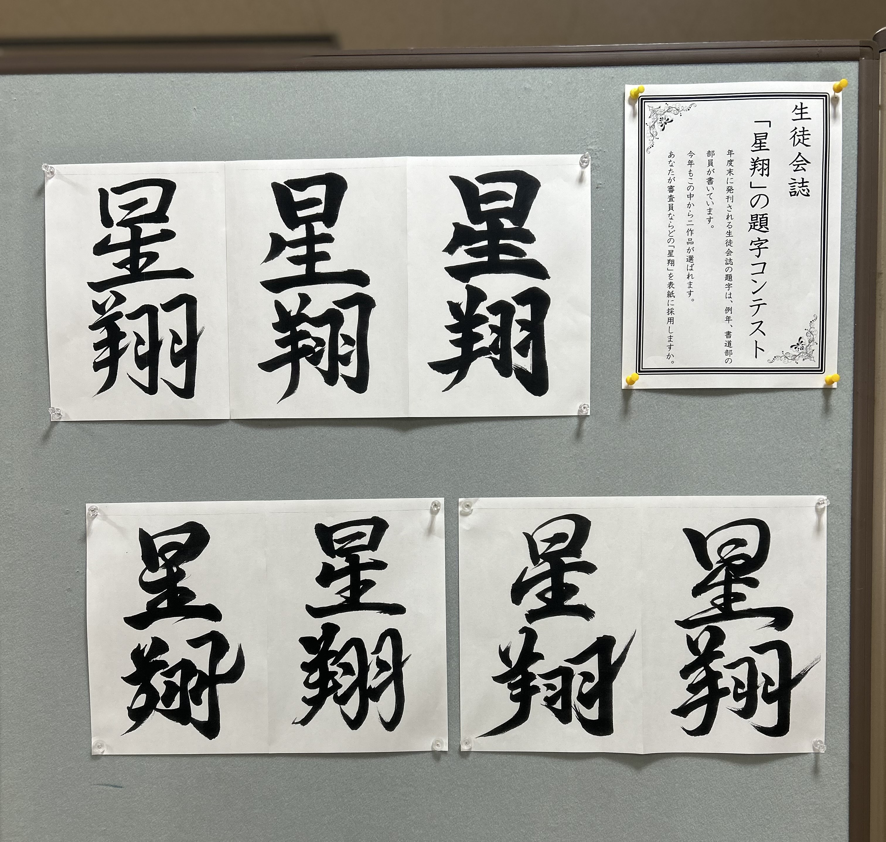 年度末に発刊される生徒会誌「星翔」の題字を書きました。どの作品をとっても、それぞれがお手本のようにとてもきれいに書けています。しかし、このように並べるとやはりそれぞれの個性が際立ちますね。この中の2つが生徒会誌の表紙と中表紙に採用されます。さて、今年はどの2作品が選ばれるでしょうか。乞うご期待!