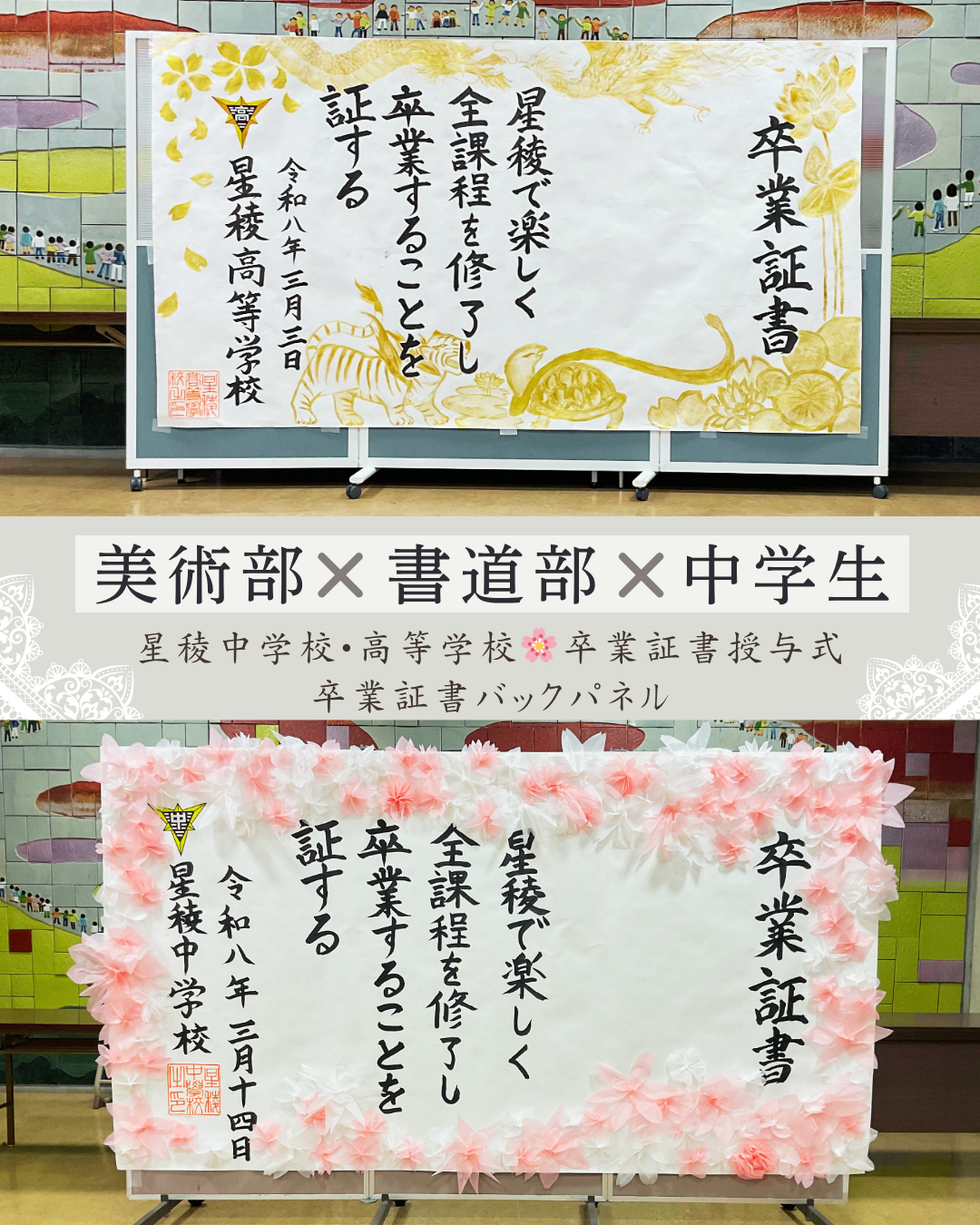 卒業生の新たな門出を祝うにふさわしい華やかな空間を演出したいという願いから、書道部一同で心を込めて取り組みました。
