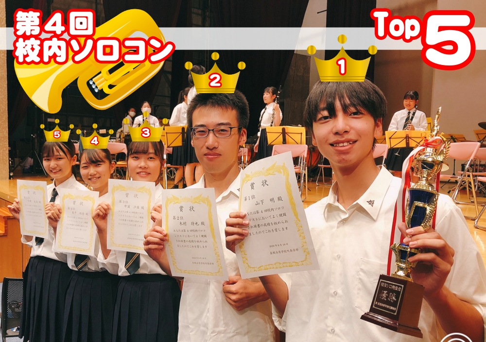 9月19日(土)、稲置記念館にて第4回校内ソロコンテストを行いました。今年度は、コンクールや演奏会といった「本番」がほぼない中での試みとなり、1年生にとっては、高校生になって初めての大会となりました。今回は一人で演奏する緊張感を味わいつつ、個々の技量を磨く良い機会となり、全員が身が引き締まる時間を過ごしたように思います。結果は、1位 山下 明(1年・チューバ)、2位 木村 将也(2年・チューバ)、3位 中濱 沙羅(2年・フルート)、4位 東平 璃香(2年・クラリネット)、5位 中野 夏衣(2年・アルトサクソフォン)となりました。入賞者の皆さん、本当におめでとうございます!参加した皆が今回のコンテストでの課題を見直し、今後の演奏に活かしていけたらいいですね!次回は、アンサンブルコンテストです。