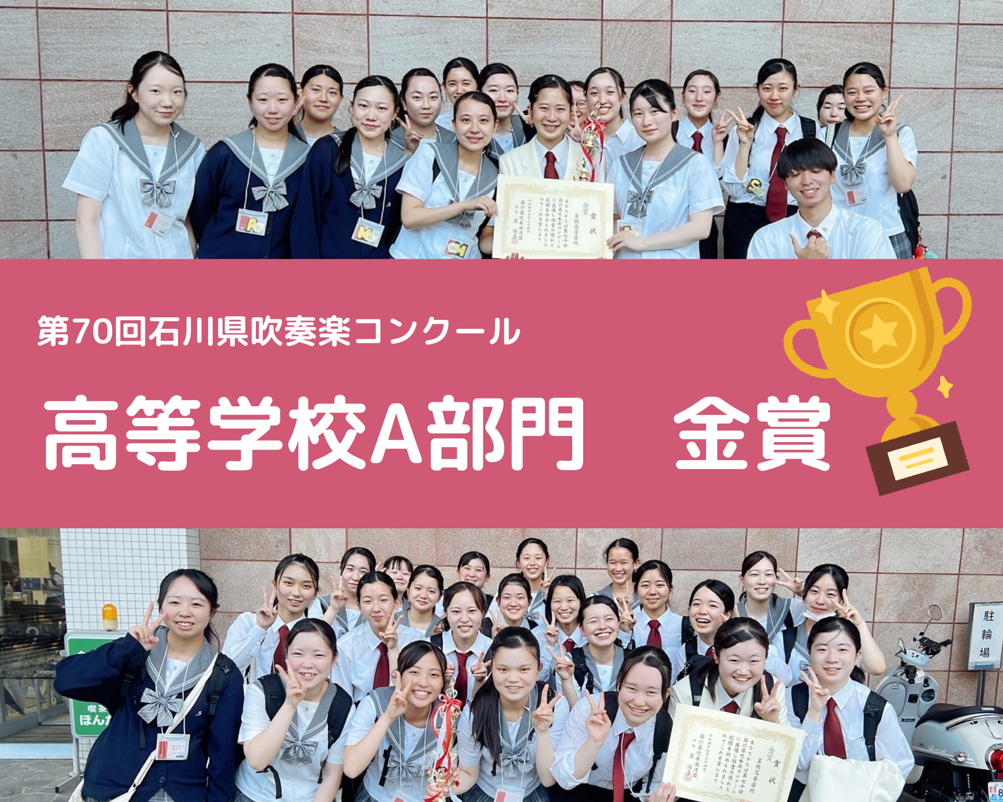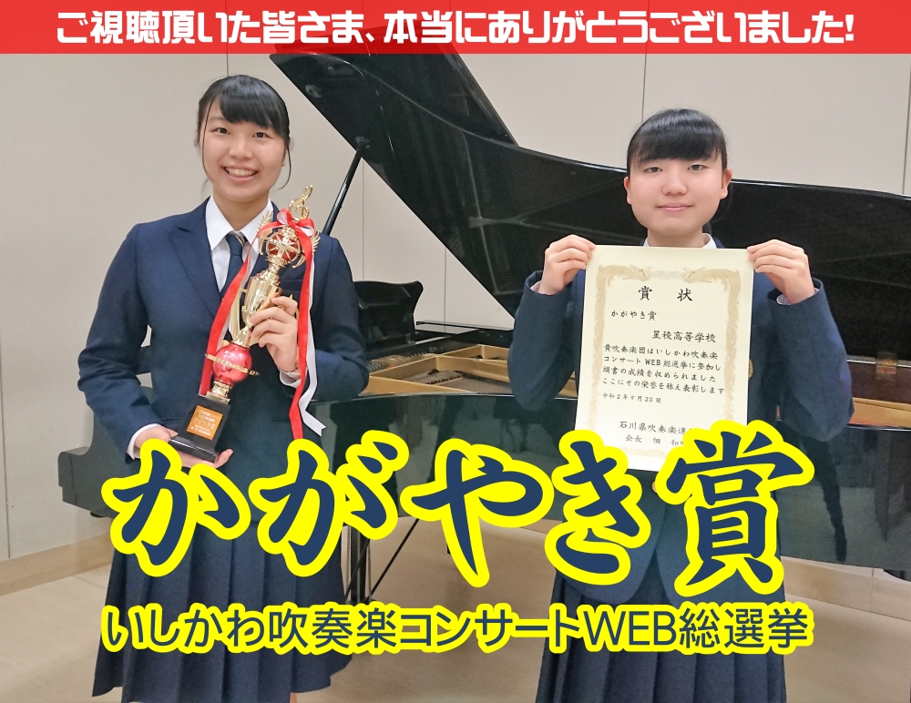 8月から石川県吹奏楽連盟ホームページ上で実施されていた「いしかわ吹奏楽コンサートWEB総選挙」ですが、皆さまの温かい応援のおかげで、高評価獲得票数は「587いいね!」となり、全出場団体中第2位「かがやき賞」を受賞することができました!「高評価」の投票をしてくださった皆さまはもちろん、ご視聴していただいたすべての皆さまに対して、部員・顧問一同、心から感謝の思いをお伝えしたいと思います。本当にありがとうございました!そしてこれからも応援よろしくお願いいたします!!
