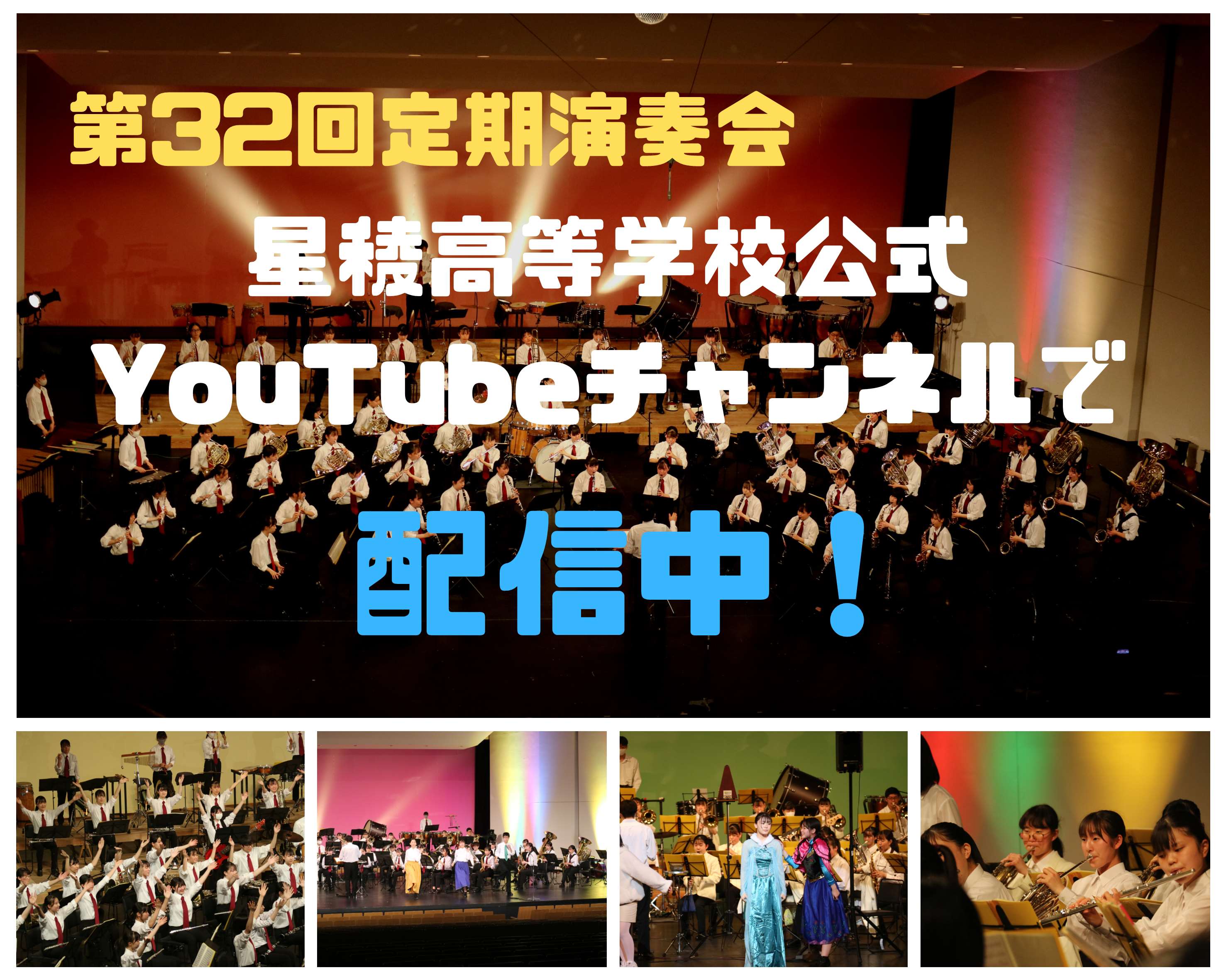 大変お待たせしました。第32回定期演奏会の映像を星稜高等学校公式YouTubeチャンネルで配信中です。1部はアルメニアンダンス・パート1などを収録したクラシックステージです。2部は音楽劇「Frozen」などを収録したポップスステージで、アンコール演奏では、あの応援歌も演奏しております。ぜひ一度ご覧ください!('ω')!!