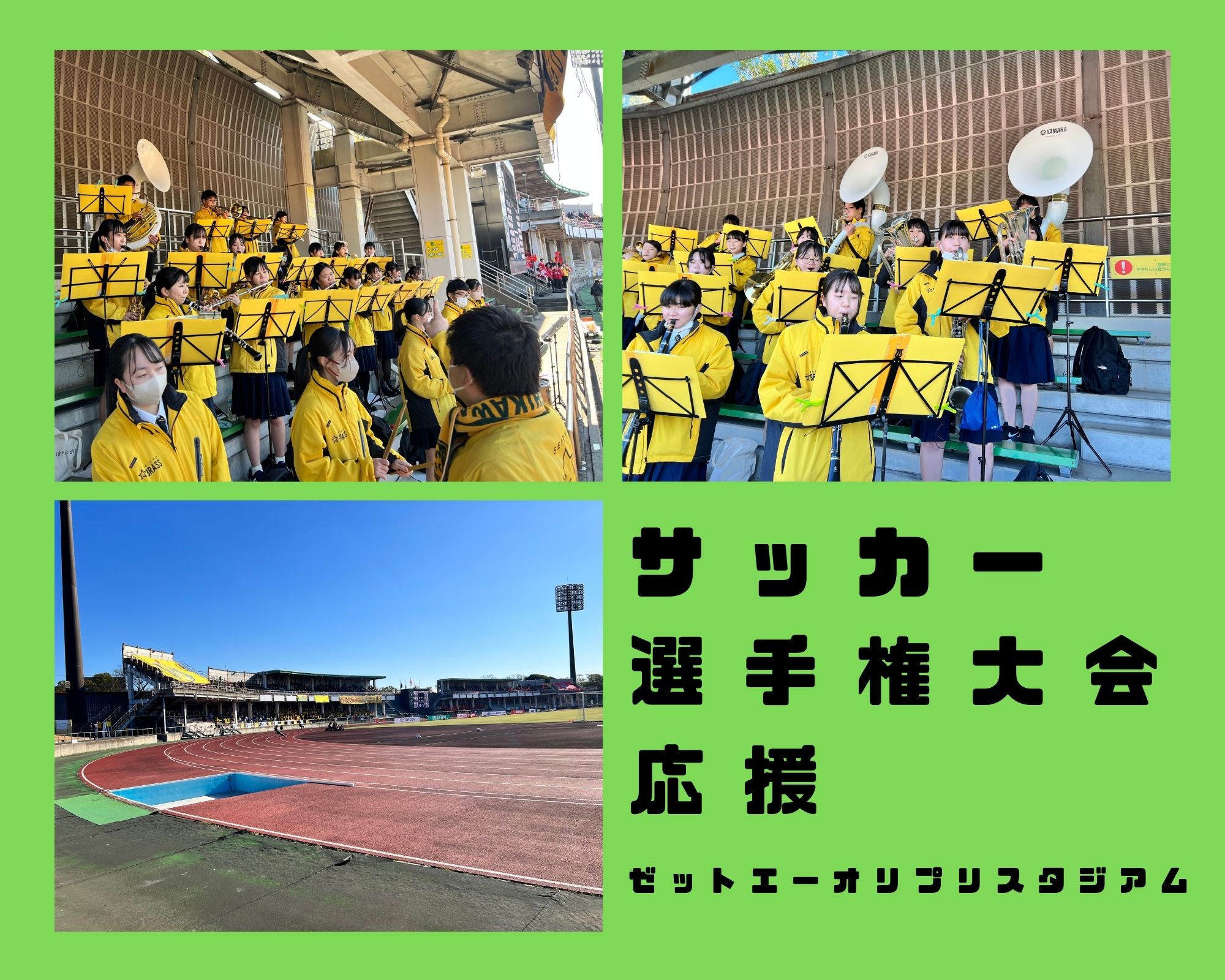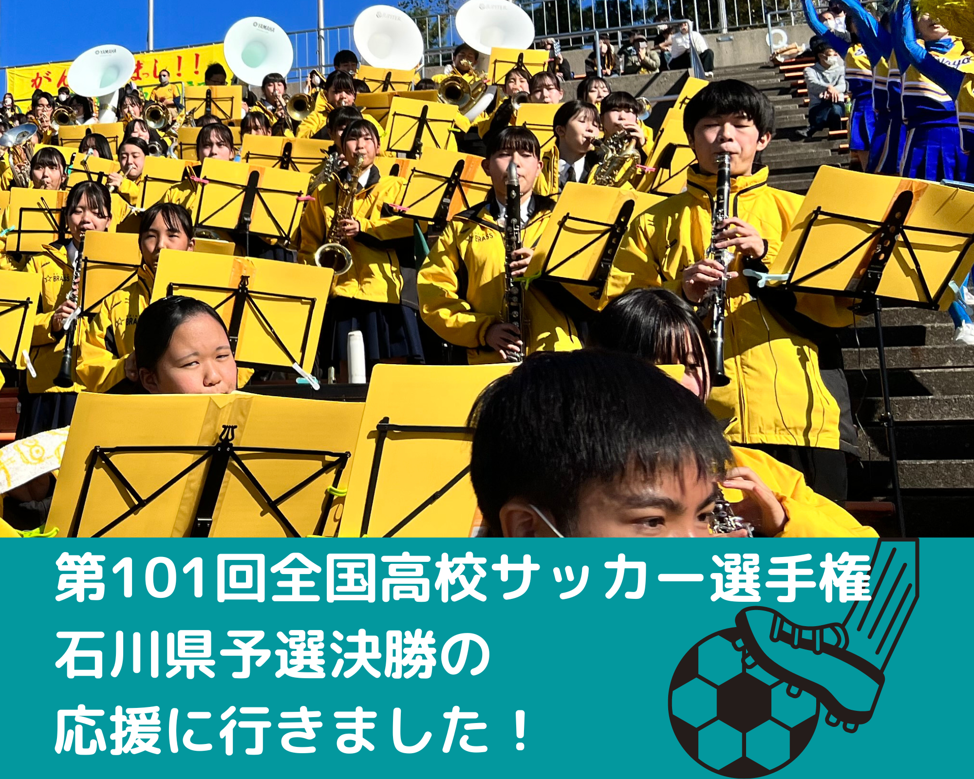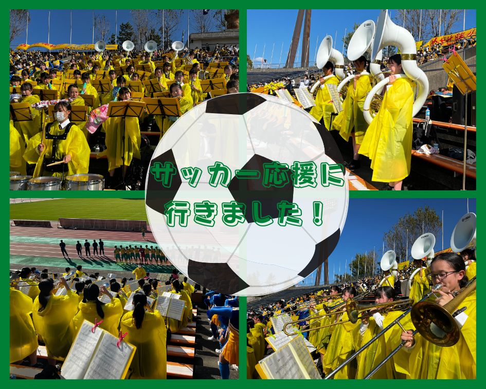 11月7日(日)、第101回全国高校サッカー選手権石川県予選決勝の応援に行きました!サッカー部の皆さんに私達吹奏楽部の熱い演奏でエールを送ることができ大変嬉しく思います。得点が入った時に星稜コンバットを吹くのはものすごく気持ちが良かったです。吹奏楽部が新体制となってから初めての応援でしたが、サッカー部の皆さんが頑張っているのを見てすごく元気を頂きました! 優勝おめでとうございます。全国大会の舞台でも頑張ってください! 星稜高校ならではの貴重な体験をさせていただき、ありがとうございました!