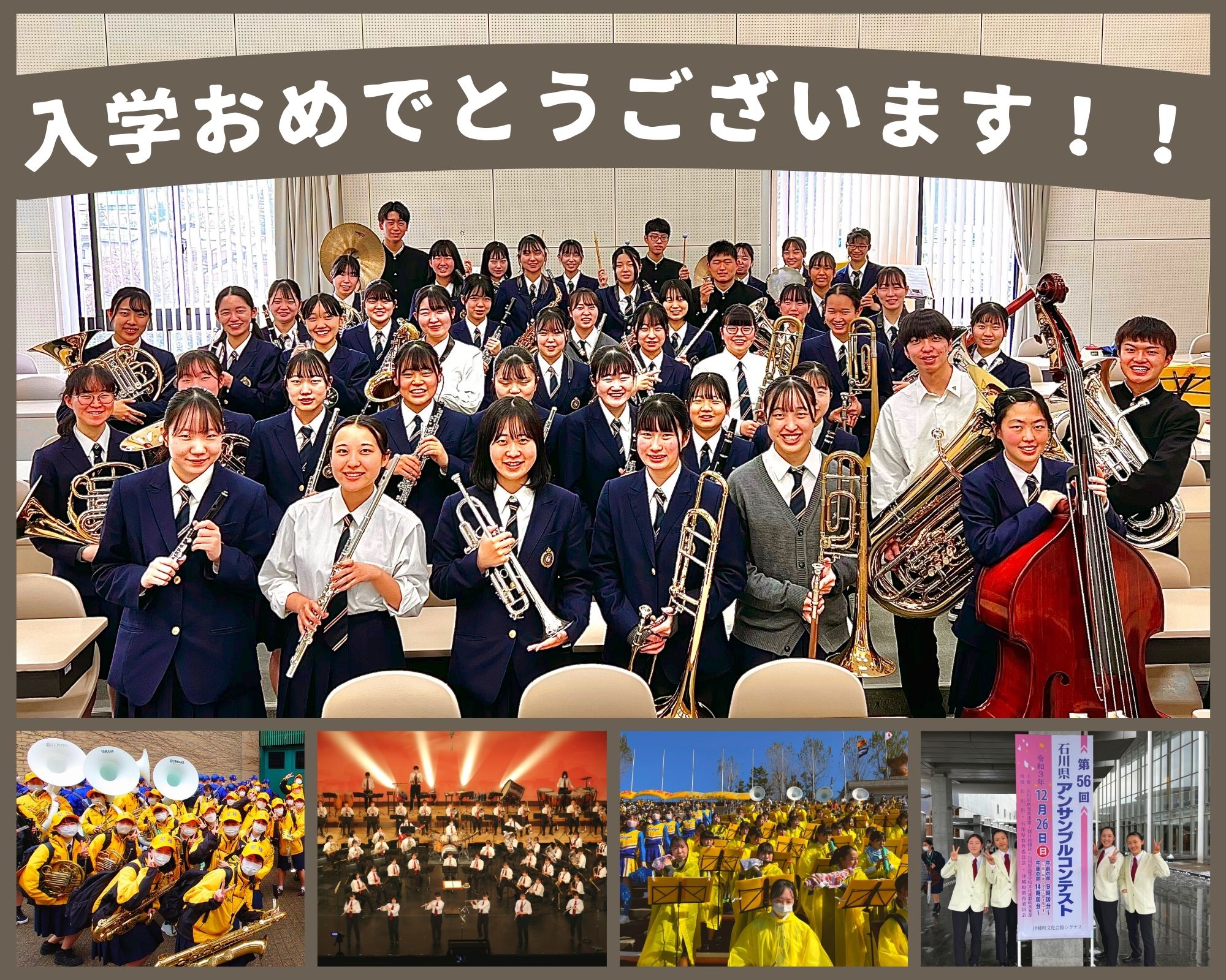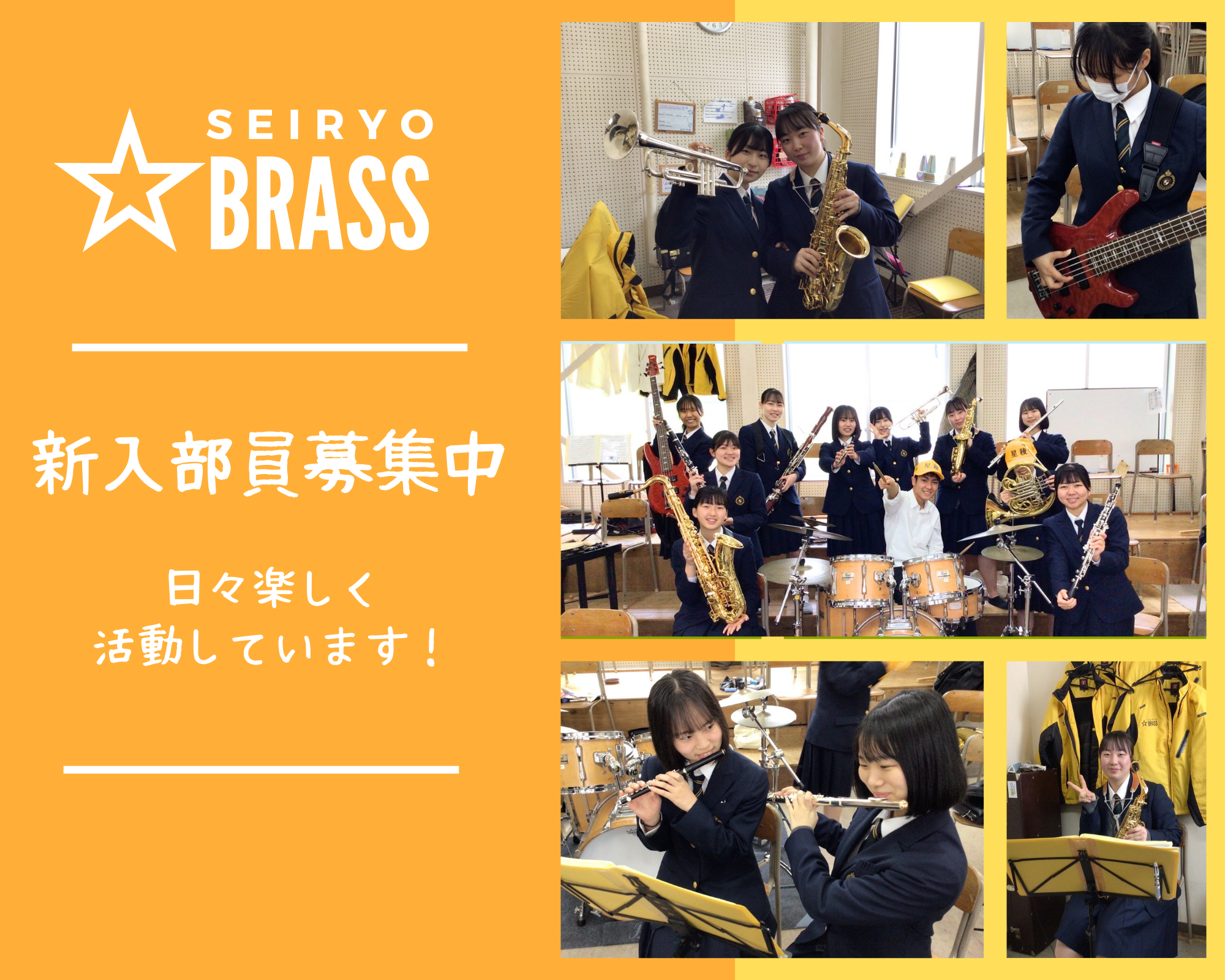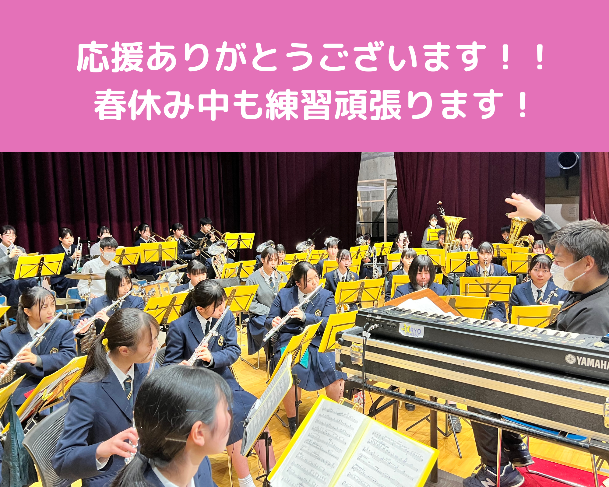新入生の皆さん、入学おめでとうございます!!!入学式における吹奏楽部の歓迎演奏はいかがでしたでしょうか?吹奏楽部は現在70名で活動しています。星稜高校の中でも部員数は多い方で、学年の垣根だけでなく、中学・高校の垣根を越えて活動できちゃいます!経験者・初心者問わず、沢山の新入部員を募集しています。コンクールや演奏会、スポーツ応援など『星稜ブラス★』が活躍できるシーンは県内外にまで広く及んでいて、とても毎日が充実しています。大勢の仲間と音楽を奏でる充実した高校生活を過ごしてみませんか!?楽器を持っていない人も気軽に相談してくださいね。興味がある人は「楽器体験会」にぜひ参加してください!!お問い合わせは1年職員室、下村(しもむら)まで。