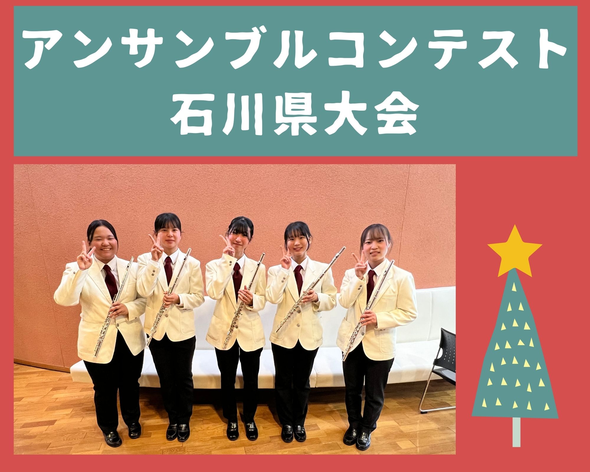 12月25日(日)のクリスマスの日に、津幡町文化会館シグナスで第57回石川県アンサンブルコンテストが行われました。校内予選、金沢支部大会を勝ち上がった金管8重奏とフルート5重奏が進出しましたが、残念ながらコロナウィルス感染のため金管8重奏は辞退、フルート5重奏も銅賞という悔しい結果になってしまいました。1月のいしかわ吹奏楽コンクール新人戦でリベンジします!