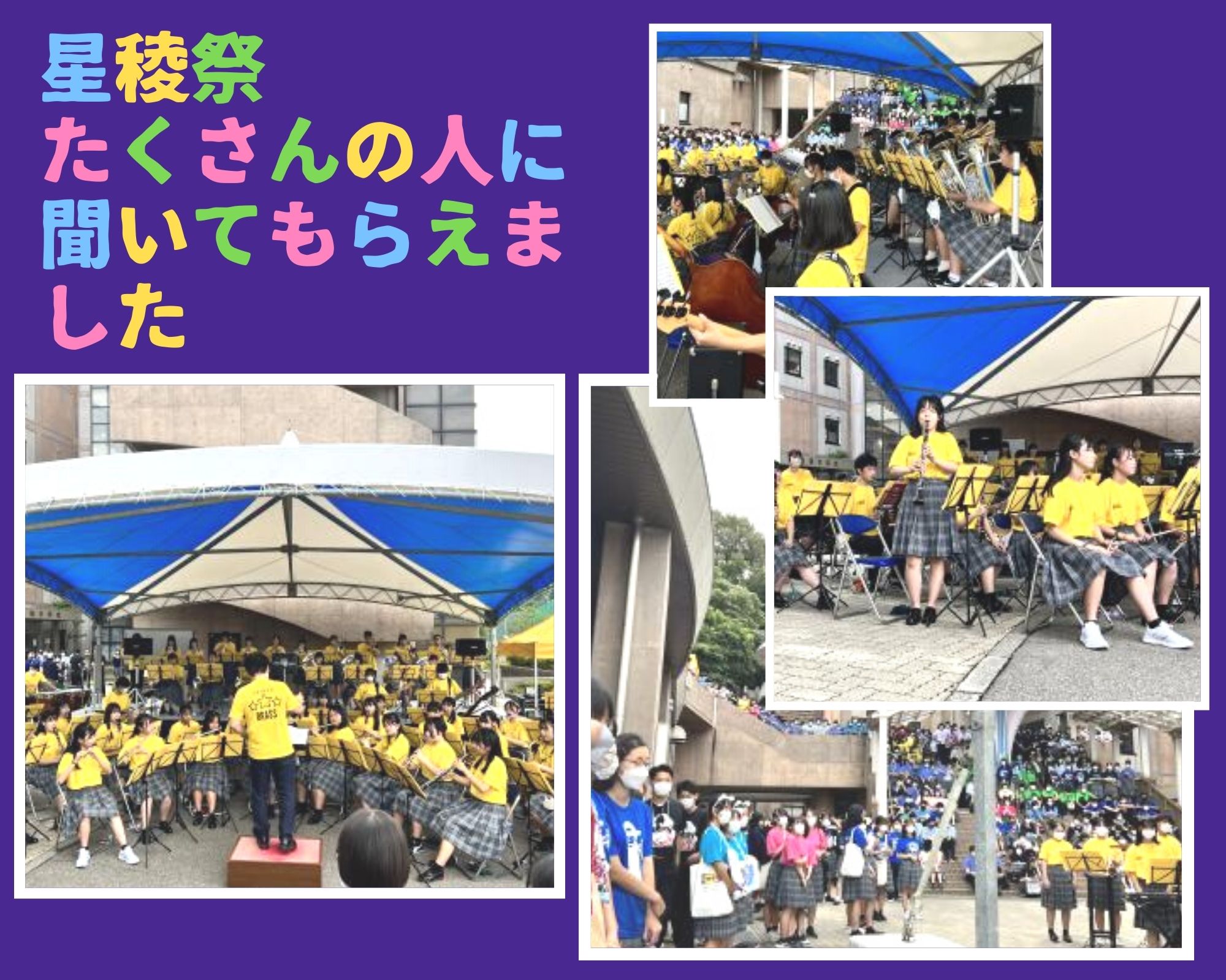 今年は従来通りの星稜祭を開催することができました。私たち吹奏楽部も久しぶりにオープニングセレモニーで演奏しました。引退した先輩方をはじめ、たくさんの生徒、先生に聴いていただくことができてうれしかったです。2年生、1年生部員でこれからも頑張って演奏していきます!