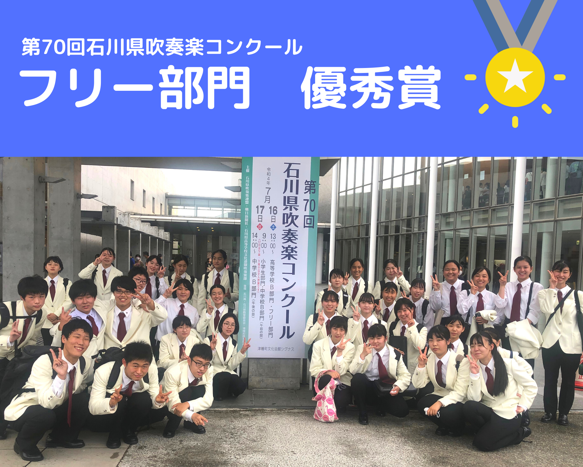 7月17日(土)、津幡町文化会館シグナスにおいてフリー部門が行われ、優秀賞を獲得しました。フリー部門への出場は初めての試みでしたが、多くの部員がより良い音楽とは何かを考えながら、練習に励みました。また、高等学校A部門は25日(日)に金沢歌劇座において行われ、銀賞を獲得しました。感染症対策のため練習もままならない状況でしたが、無事に出場することができました。本当にありがとうございました!