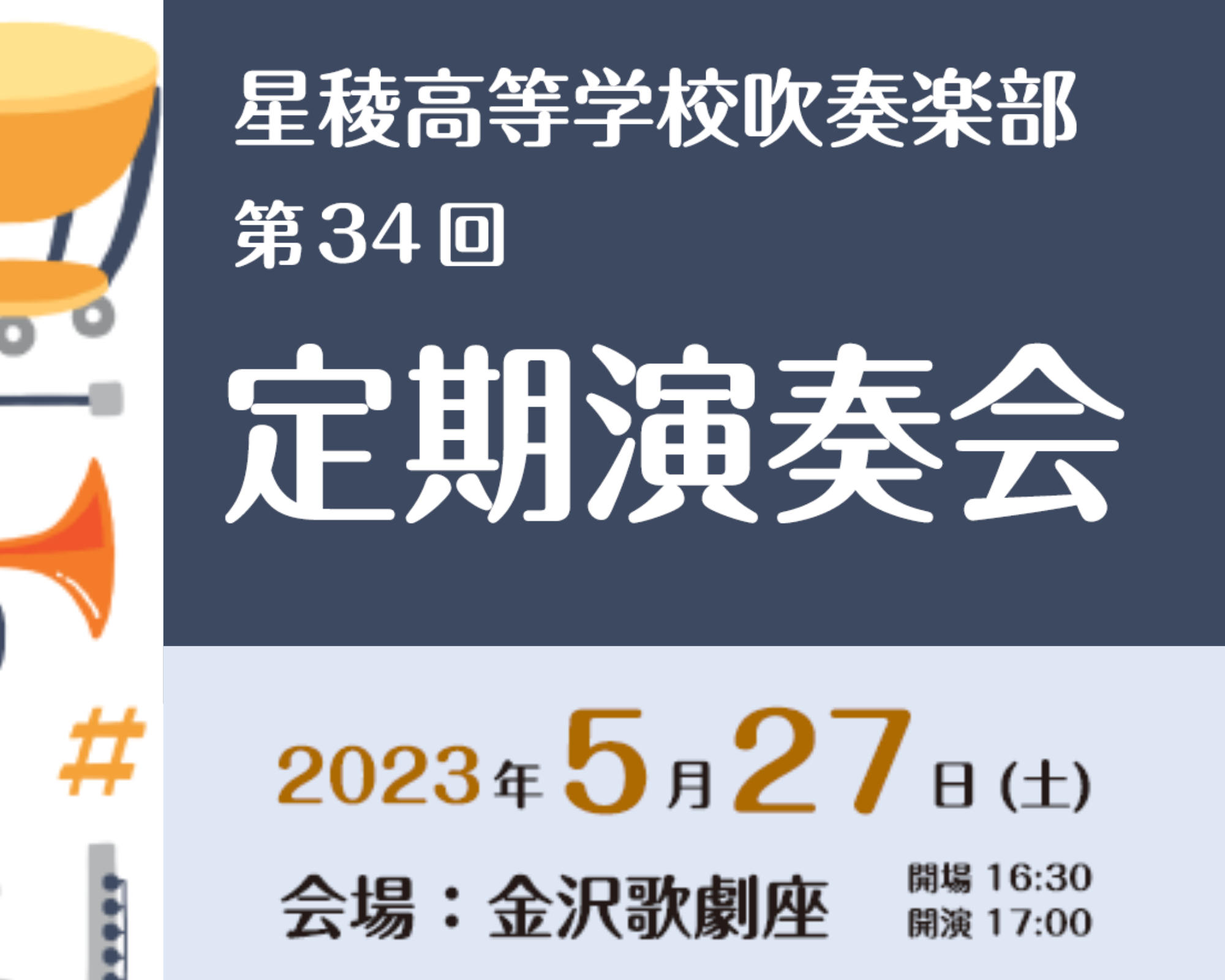 5月27日(土)17:00より、金沢歌劇座にて吹奏楽部第34回定期演奏会を開催します!チケットは大人¥800(当日¥900)、高校生以下¥500(当日¥600)となっています。お近くの吹奏楽部員、または顧問、ポスターに記載の県内各プレイガイドにてお求めください。吹奏楽の醍醐味が味わえる作品はもちろん、音楽劇「Aladdin」など、みなさんにお楽しみいただけるプログラムです。5月最後の週末はみんなで歌劇座へ!部員一同ご来場をお待ちしております!!