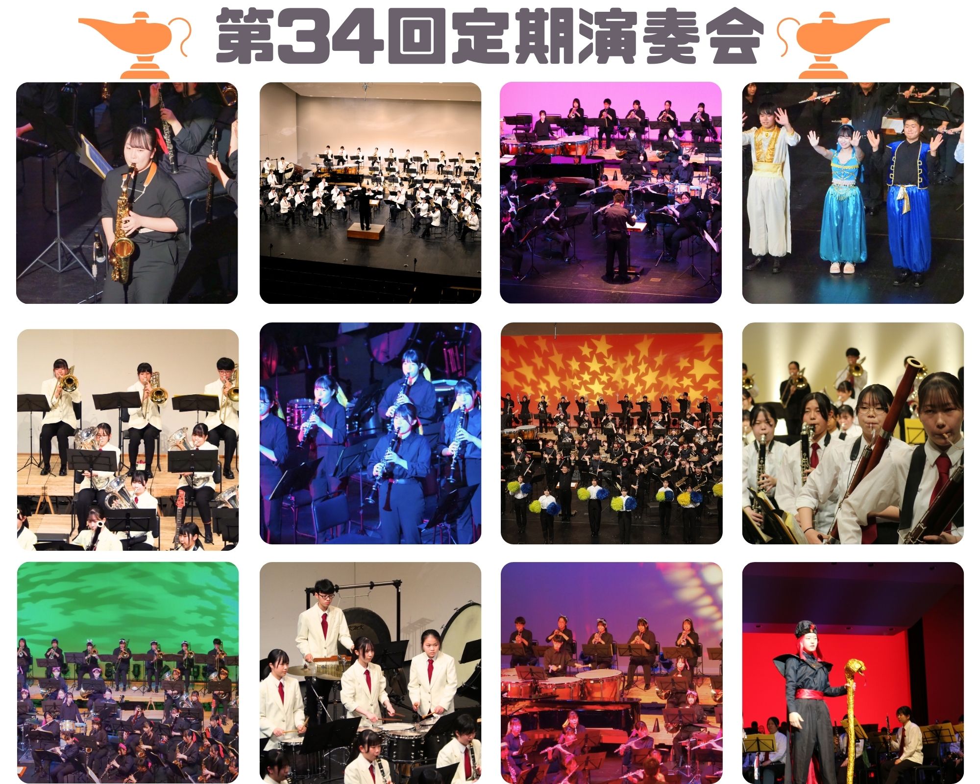 5月27日(土)、金沢歌劇座にて第34回定期演奏会を開催しました。第1部ではこの夏のコンクールで演奏をする2曲を含む5曲を演奏しました。緊張感のあるステージでしたが、今後の課題も含めて様々なことを体感できました。第2部は音楽劇「Aladdin」。この日まで一生懸命リハーサルをしてきたことをすべて発揮し、お客様を笑顔にできたと思います。第3部からアンコールまではあっという間に時間が過ぎ、いつの間にか客席のお客様と一体となってステージを楽しんでいることに気が付きました。とくに新型コロナ感染症が5類移行し、様々な制限が緩和された中、合唱をお披露目することができたことは私たちにとっても感動的でした。ここまでの努力が報われ、素晴らしいひと時を過ごすことができました!お越しいただいた皆さま、本当にありがとうございました!そして、ここまで支えてくださった沢山の方々に感謝を伝え、定期演奏会で経験したことをこれからの部活動に活かしていきたいと思っています。