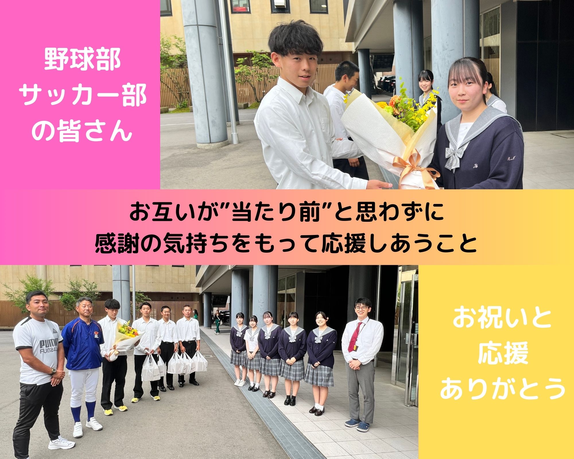 定期演奏会の前日、開催にあたり野球部とサッカー部の皆さんからお祝いとエールをいただきました!普段、吹奏楽部では選抜大会や選手権大会などでの応援をさせていただいていますが、このようなやり取りを通じてお互いを支え合い、応援することの素晴らしさ、そしてたくさんの仲間達が私たちの活動を支えて下さっているというありがたさを心から実感しました。野球部やサッカー部はもちろん、星稜高校で頑張る皆さんをこれからも演奏で応援していけたら嬉しいです!