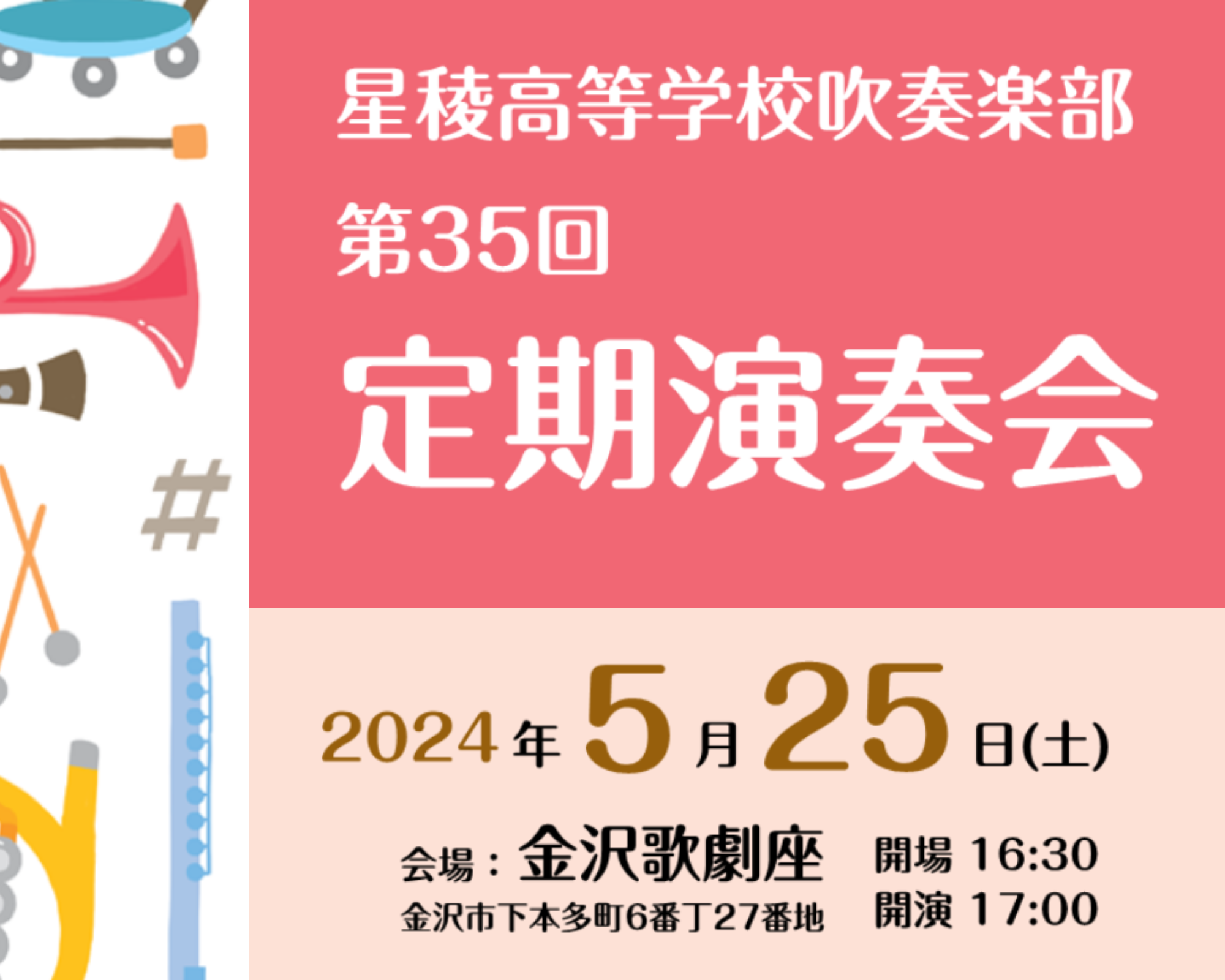 5月25日(土)17:00より、金沢歌劇座にて吹奏楽部第35回定期演奏会を開催します!チケットは大人¥800(当日¥900)、高校生以下¥500(当日¥600)となっています。お近くの吹奏楽部員、または顧問、ポスターに記載の県内各プレイガイドにてお求めください。