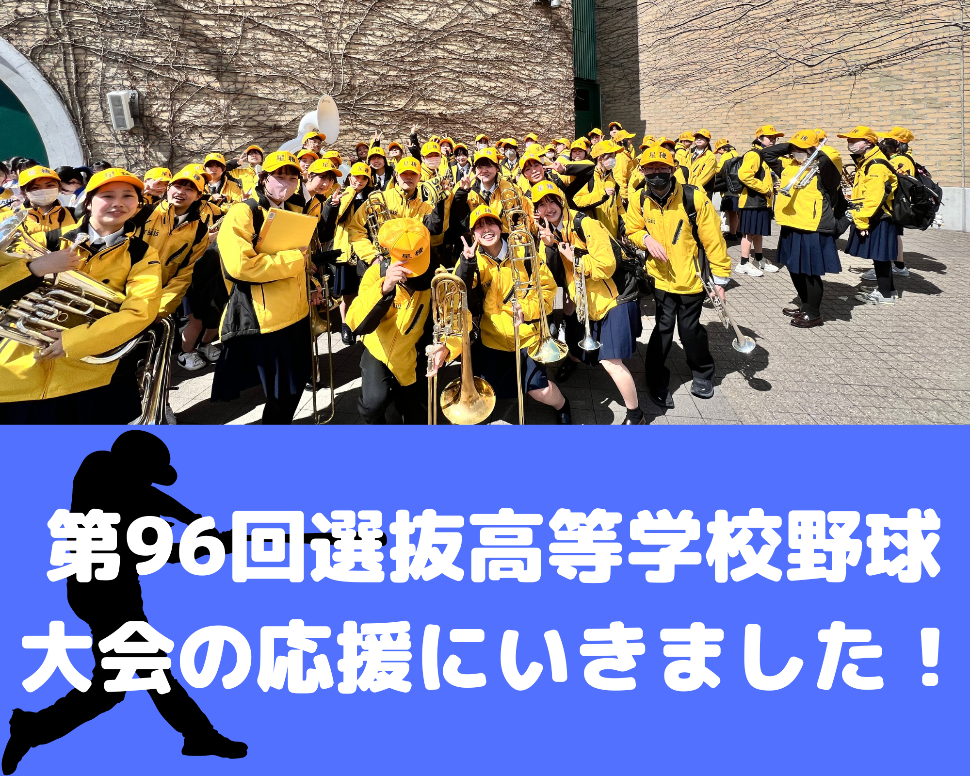 第96回選抜高等学校野球大会の応援に参加させていただきました。大きな球場、たくさんの人の前で演奏できる、素晴らしい機会をいただきありがとうございました!また他校の素晴らしい演奏も聞くことができてとても良い経験になりました。