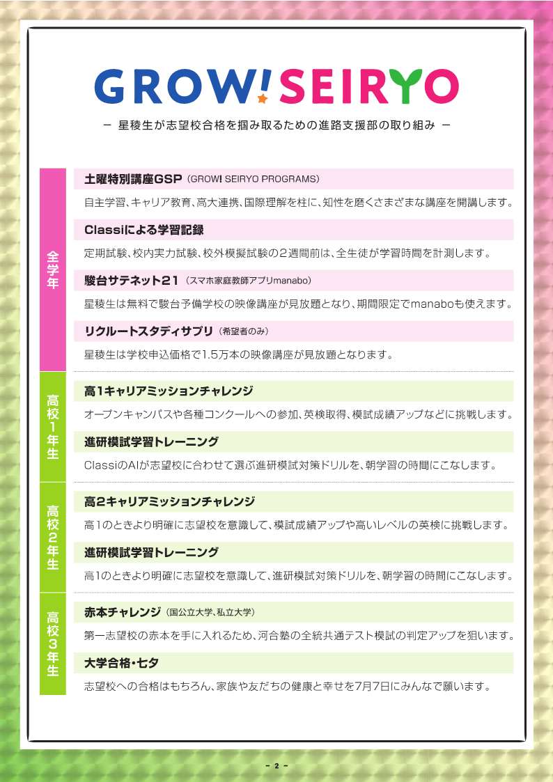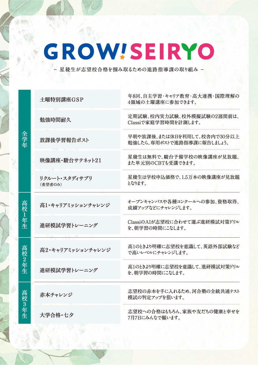 進路支援課では、生徒一人につき1台貸与しているタブレットを活用し、メッセージ機能がついたインタラクティブな学習記録を可能とする「学習時間耐久」や朝の時間を活かしたAIによる「進研模試学習トレーニング」をはじめ、高1・高2を対象とした「キャリアミッションチャレンジ」や高3を対象とした「赤本チャレンジ」、また放課後の学習を推奨する「放課後学習報告ポスト」の設置など、学習及び課外活動に対して前向きな姿勢を促すさまざまな教育活動を実施しています。オンライン学習についても、Classi「学習動画」をはじめ、駿台予備学校「サテネット21」は無料で見放題に、リクルート「スタディサプリ」は希望者に特別な対応をするなど、どこよりも幅広く応援しています。