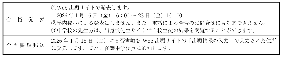 ・合格発表につきましては、こちらのWeb出願サイトにてご確認ください。