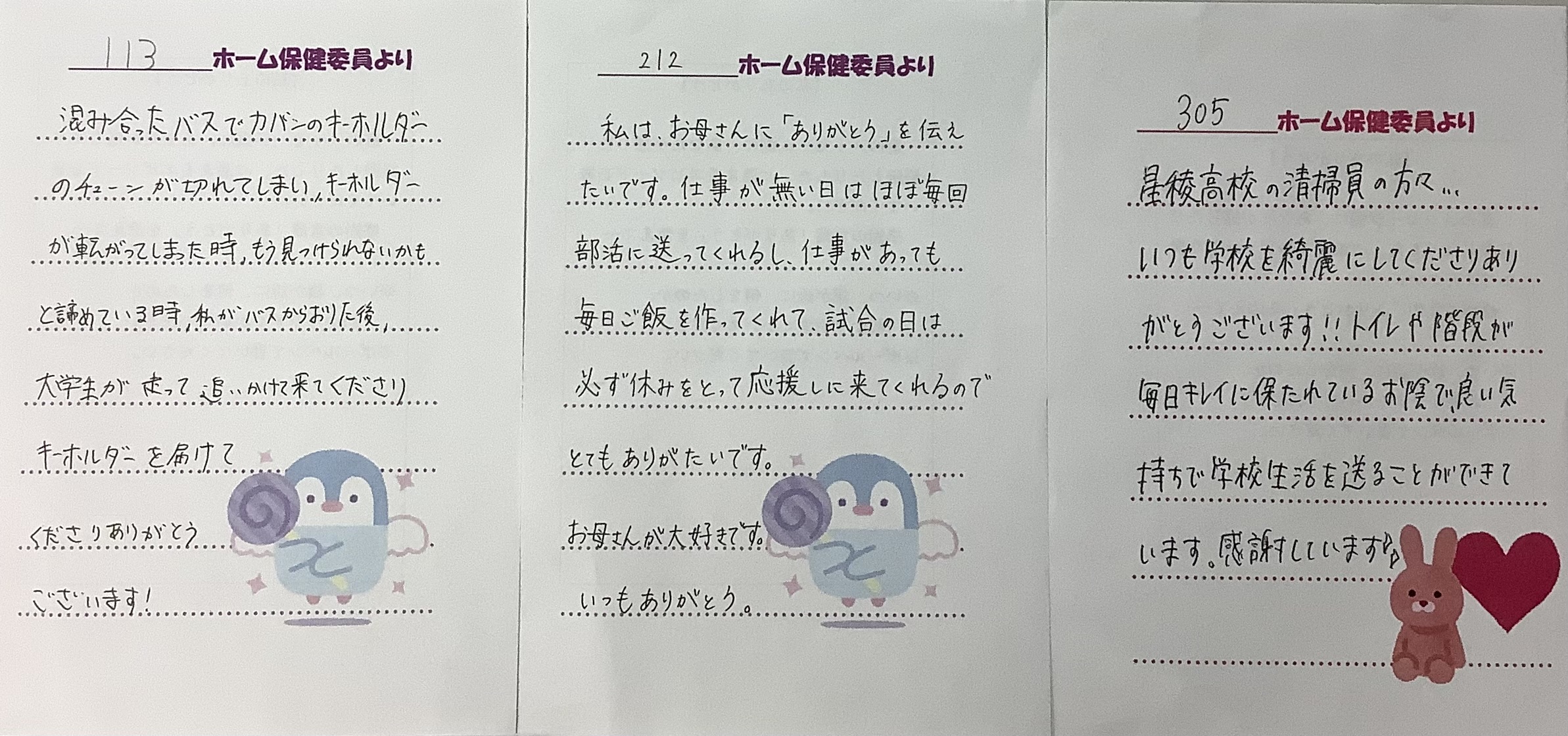 全てのありがとうカードを読ませてもらいましたが、どれも素敵で心が温まりました。その中でも時に印象に残った113ホーム、212ホーム、305ホームの3名をベストありがとうとして選出させていただきました。見ず知らずの人からのやさしさへの感謝、いつも支えてくれる親御さんへの感謝、学校の環境を整えてくれる清掃員の方々への感謝、たくさんの人の優しさや支えによって生活できていることを実感させられました。日々の感謝を忘れずに過ごしていきたいですね。
