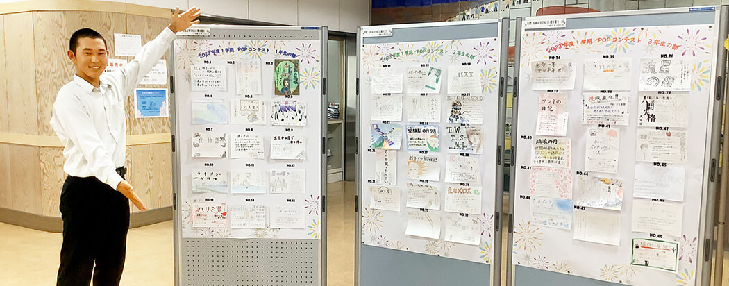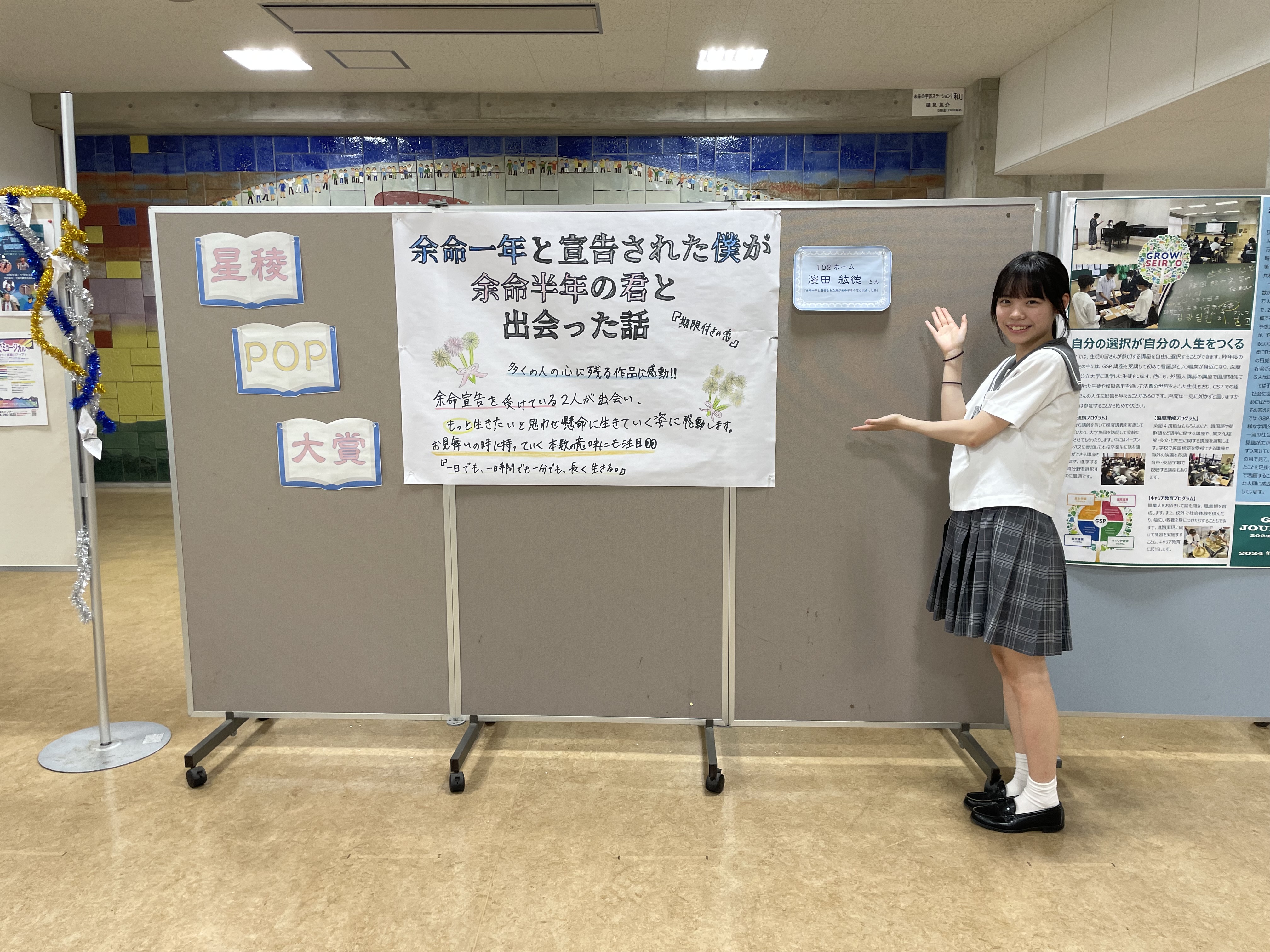 私たち図書委員会は、1学期に図書委員おすすめの本を紹介するためにPOPコンテストを行いました。全校生徒の投票によってPOP大賞に102ホーム濱田 紘徳さんの「余命一年と宣告された僕が余命半年の君と出会った話」が選出されました。