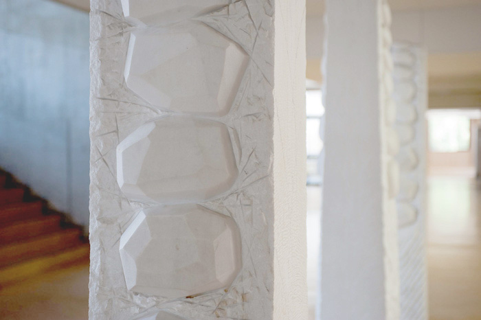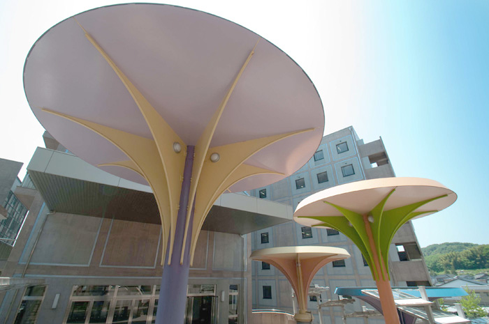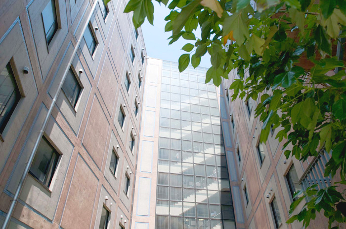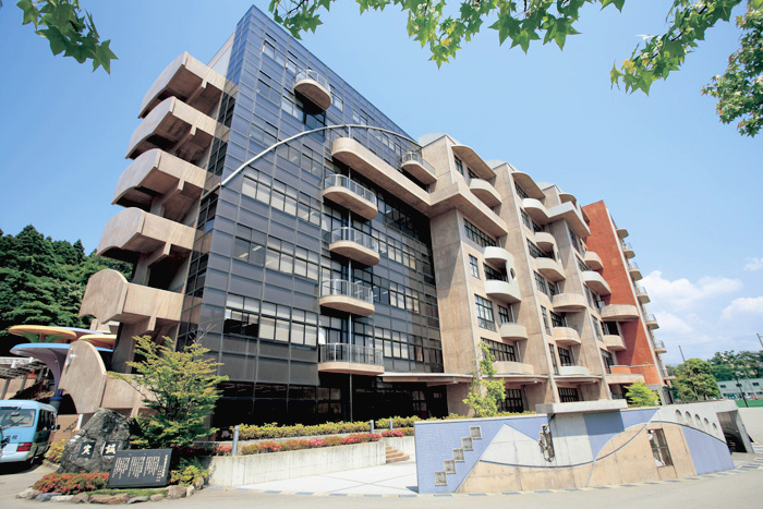 中央の広場を中心に四方に伸びる廊下形式は、ホールに立つとほぼ全体に視野が通る管理の良さと同時に、彫刻のある広場と広い階段が「語らいの場」を提供してくれるように配慮。また、教室棟には大小さまざまな小広場があって、さまざまなコミュニケーションが出来るようになっています。