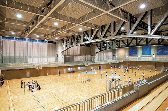 第1体育館では、巨大な空間を3つの部分に分け、その巨大さからくる恐怖感を軽減し、一人一人の心にやさしく入り込めるよう配慮しています。